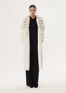 Кашемировое пальто выполнено из мягчайшего итальянского кашемира и дополнено уютным английским воротником из меха шиншиллы в тон изделия, чтобы он идеально сочетался с цветом кашемира.