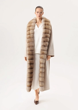 Кашемировое пальто выполнено из мягчайшего премиального кашемира и дополнено отворотной бортовой опушкой из шелковистого меха куницы.