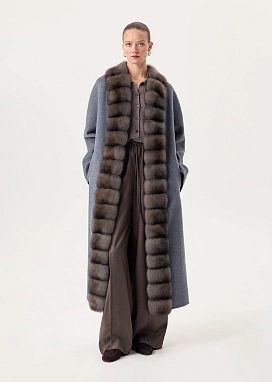 Удлиненное серое пальто с отделкой из меха соболя по борту