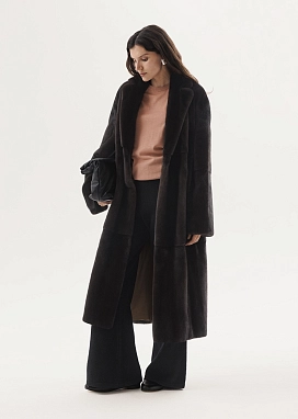 Шуба выполнена в благородном угольно-чёрном цвете, подчеркивающем природный блеск и сияние меха.