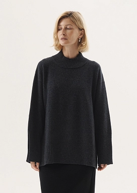 Наша новая модель — кашемировый свитер свободного силуэта с мягким воротником-стойкой в роскошном графитовом оттенке.