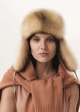 Классическая шапка-ушанка из меха куницы. Верх шапки выполнен из мягчайшего 100% кашемира в бежевом оттенке.