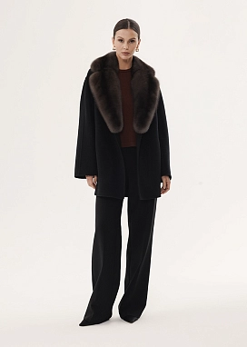 Короткое кашемировое пальто в угольно-черном оттенке с меховым воротником